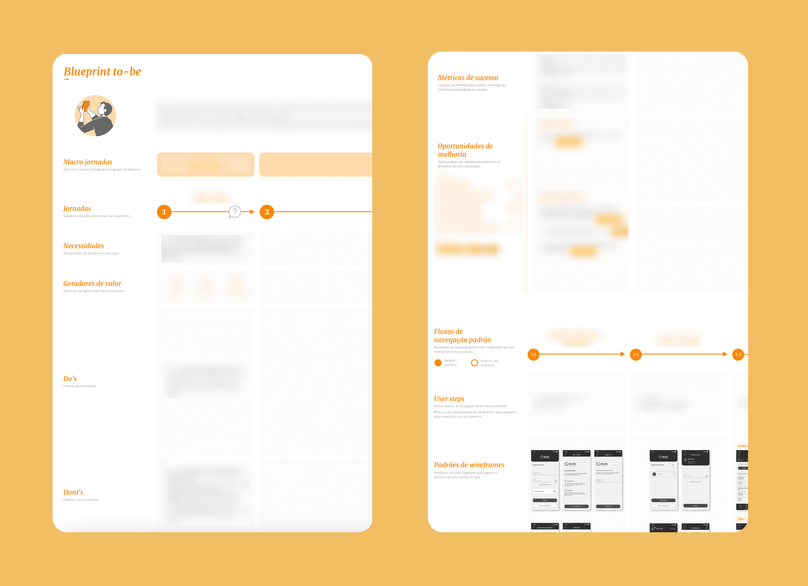 Blueprint to-be documentando o que deve ser considerado e evitado na construção das interfaces de backoffice, a partir dos direcionadores de experiência mais latentes em cada ponto da jornada e de como isso foi traduzido em templates do Design System para orientar os times.