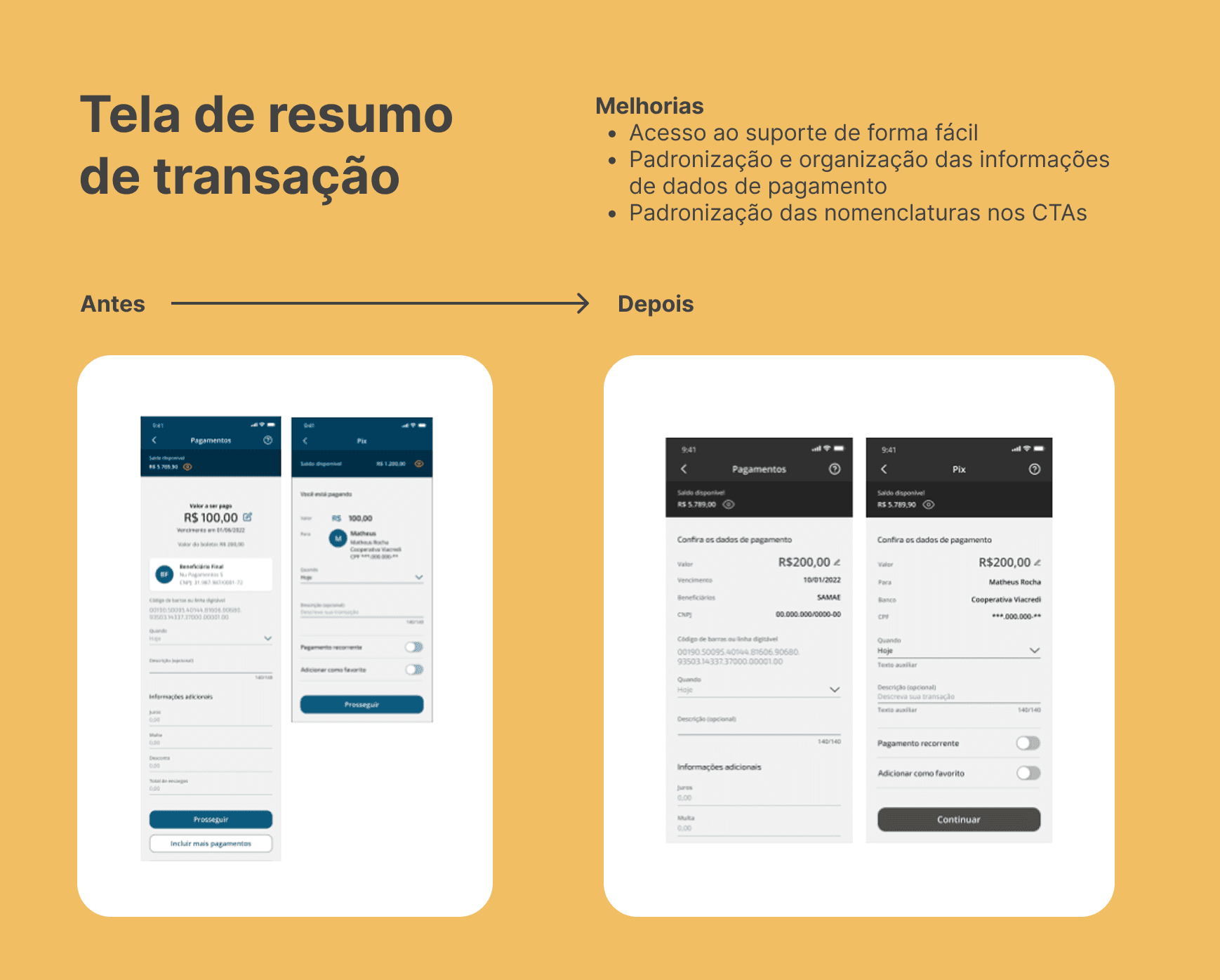 Exemplo de documentação do comparativo antes e depois da tela de resumo de transação, com foco na organização das informações e na padronização entre telas equivalentes em diferentes produtos.