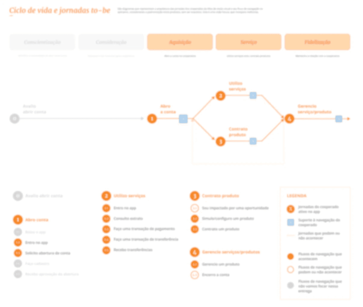Como complemento, construímos um blueprint to-be integrado, conectando a experiência do cooperado às interações de bastidores (frontoffice e backoffice) e definindo critérios de funcionamento esperados para uma operação eficiente. Por fim, essa documentação e os templates foram repassados para o time de DesignOps, permitindo que a padronização fosse incorporada à governança do Design System e escalada para os times de Delivery com um caminho comum de implementação.