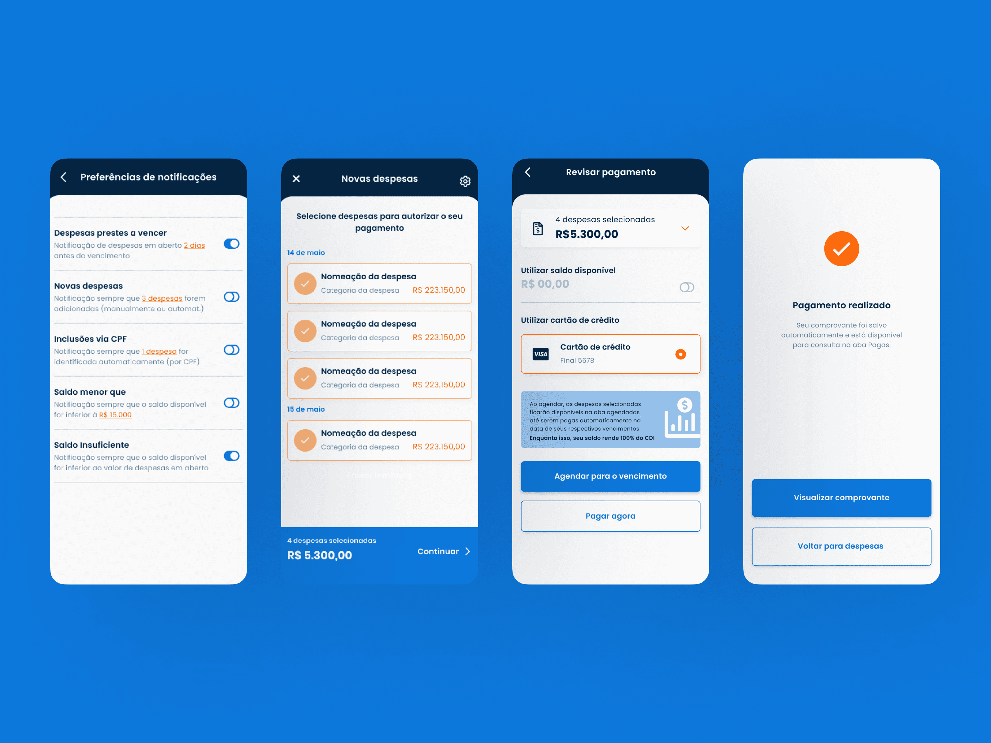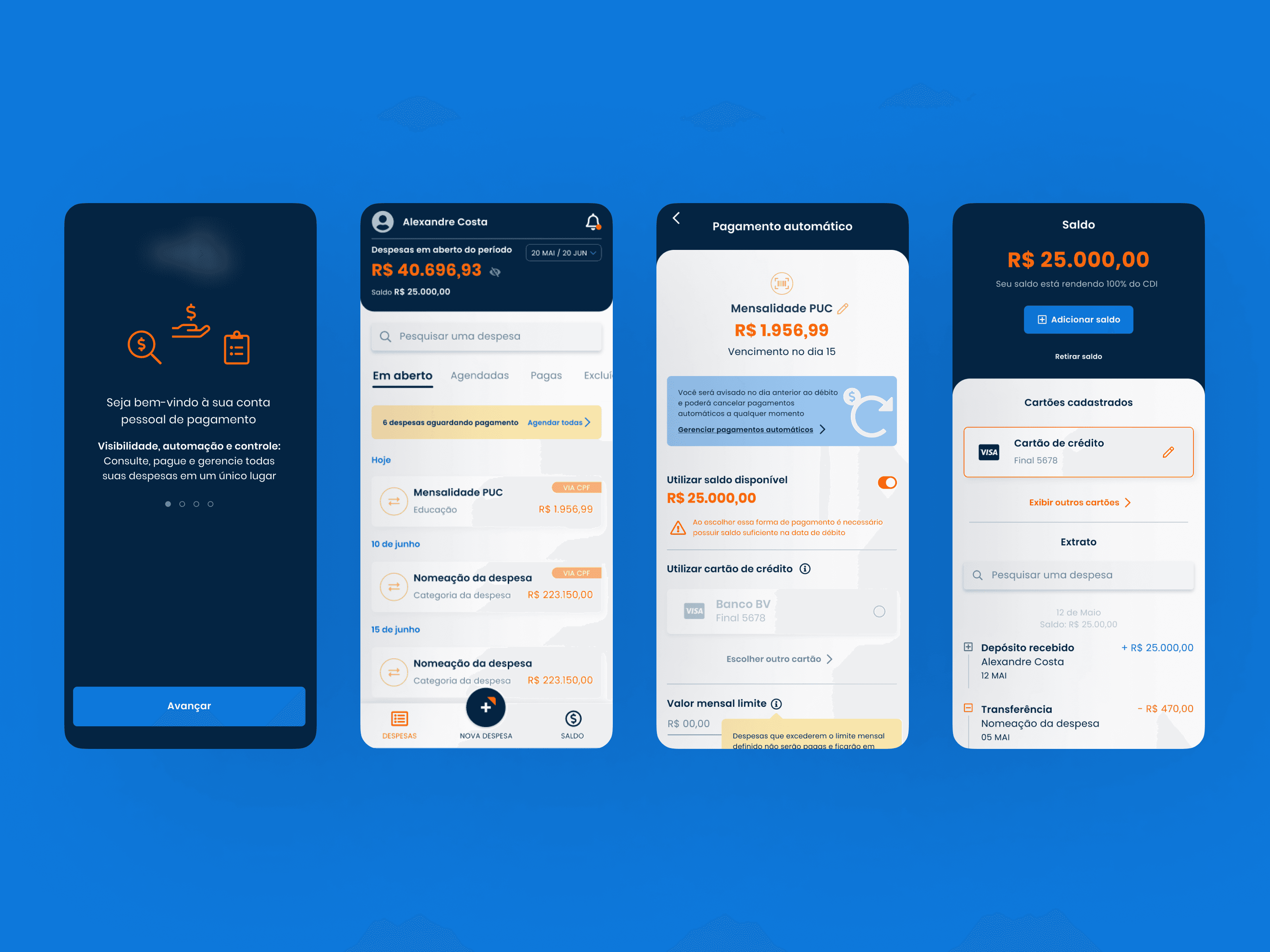 Desenhamos o onboarding e a primeira experiência de acesso e concebemos o serviço como uma conta de pagamentos, com consulta de saldo e gestão centralizada de despesas e pagamentos.